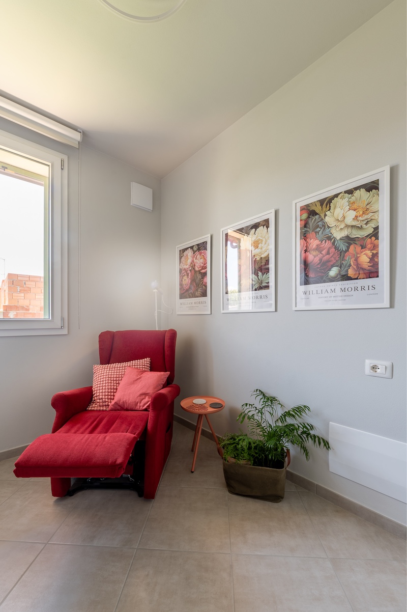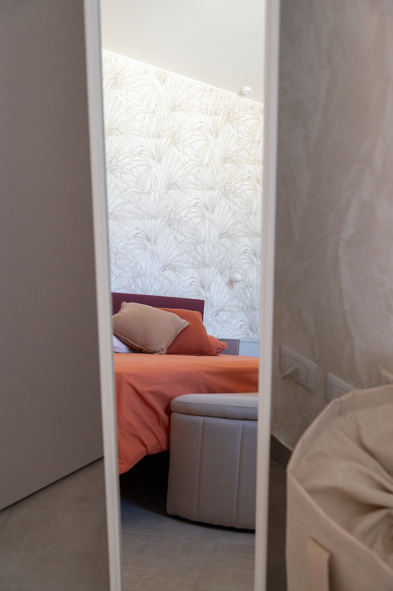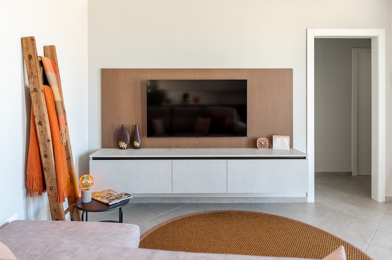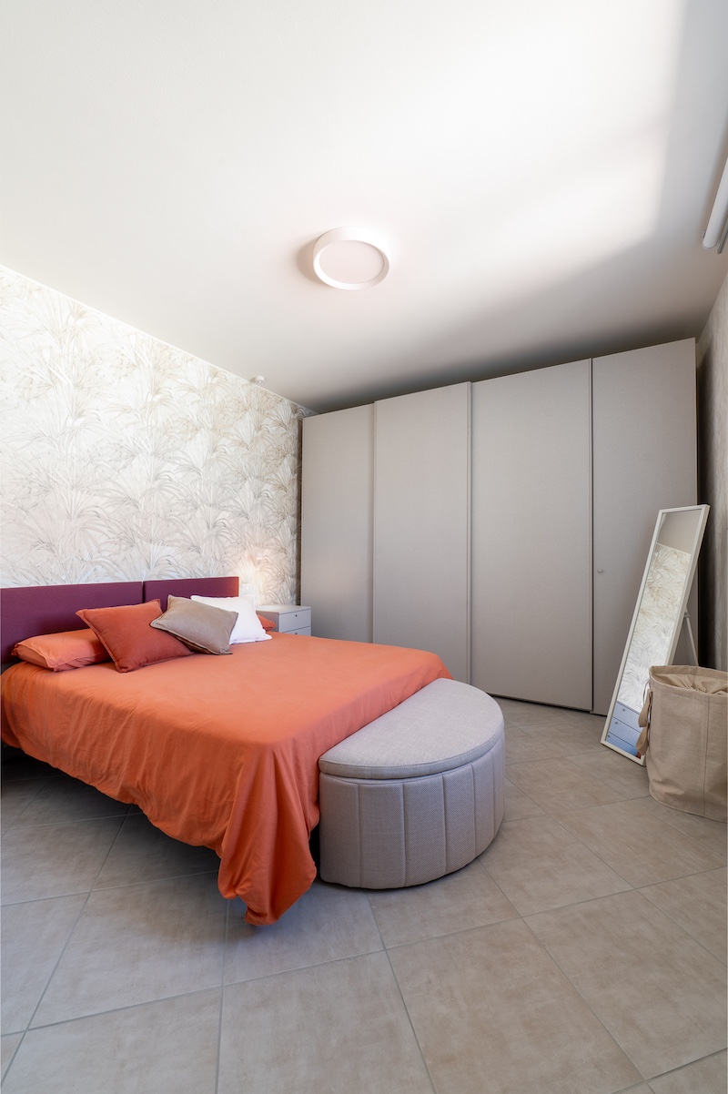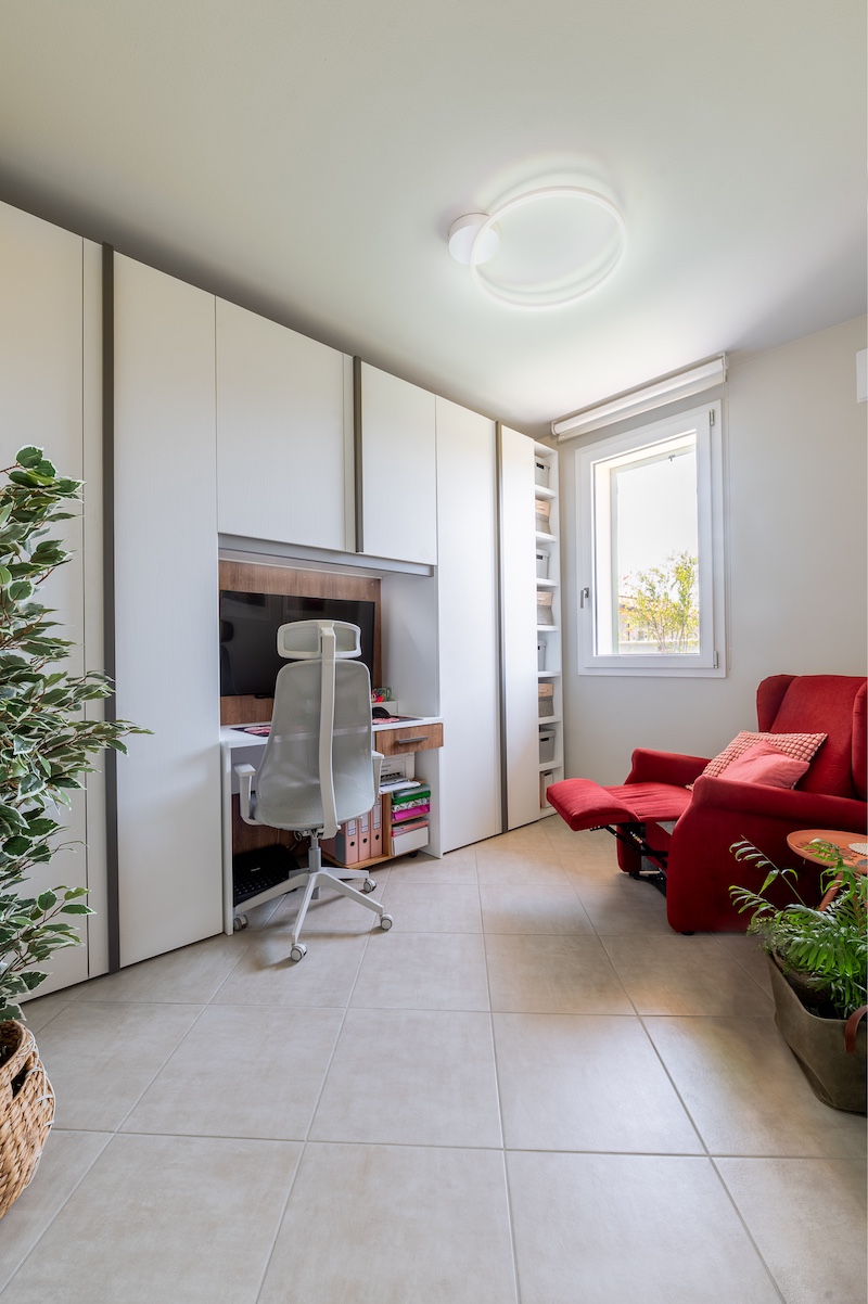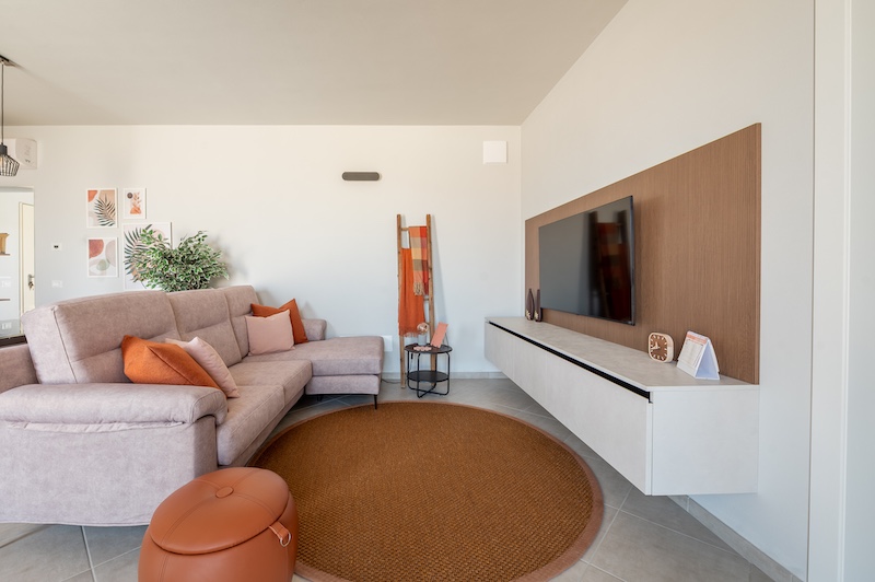 La zona giorno è un unico open space dove cucina e soggiorno dialogano con naturalezza: tavolo e divano al centro, luce continua, funzioni chiare. Ogni dettaglio è pensato per semplificare la vita quotidiana e mantenere coerenza visiva. Il risultato è una casa che li somiglia: bella da vedere, facile da vivere, luminosa ogni giorno.